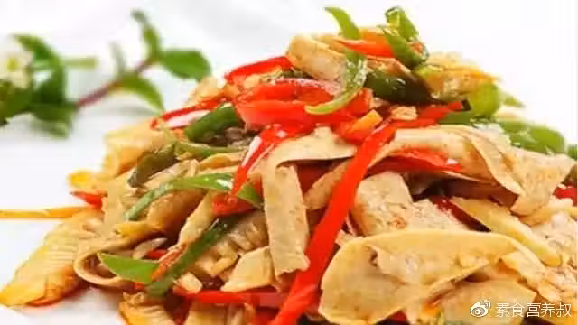 6、另起鍋,倒入少許精製油,放入竹筍片煸香,放入豆皮條煸透。