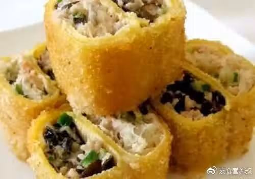 食材:豆皮(替換成油皮也不錯,還可以用素蛋皮代替),銀耳,木耳,素肉餡,麵包糠,麵粉,黃瓜(可不放),鹽,胡椒粉