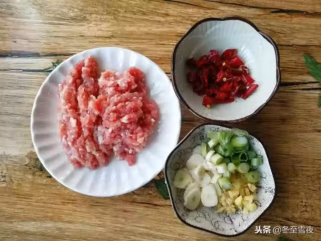 3.將豬肉切成末,蔥切蔥花、姜切末、大蒜切片、干辣椒去籽,切成小段。