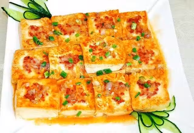 另鍋蔥花炒香放入上湯、味精、精鹽、醬油、煮沸,將煎好的豆腐放入煮開。小火燜煮三分鐘收汁裝盤。把汁收濃淋在上面,撒蔥花。