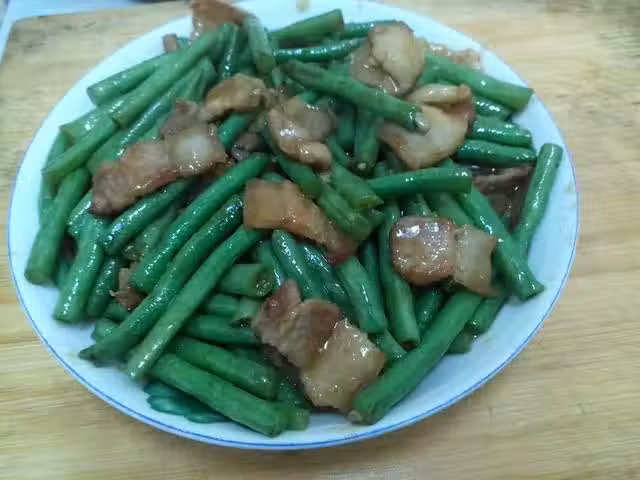 先把豆角切成小段洗乾淨,再把五花肉切好