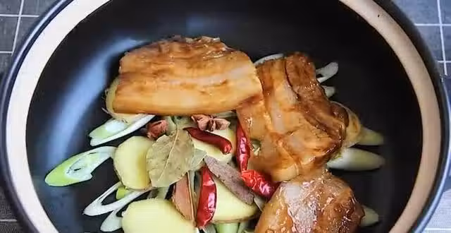 砂鍋底部鋪一層蔥片,再鋪一層薑片,放上香葉,桂皮,八角,干辣椒,將腌好的肉片均勻鋪在鍋底,剩餘的湯汁澆在肉上面,腌肉的盆中加入清水倒入肉片中,沒過肉片即可,將砂鍋移至燃氣上,開大火燒開,燒開之後轉小火,燉至湯汁微干,已經燉的差不多了,關火再燜2分鐘。