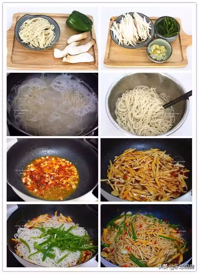 第七步:待杏鮑菇變軟後,把麵條、青椒絲放入鍋中。