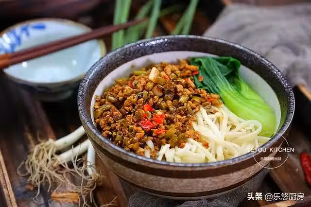 第一步:準備食材。酸豆角200克、豬肉餡200克、麵條適量、青菜適量、蔥姜蒜適量、紅辣椒適量(點綴用,可以不放)。