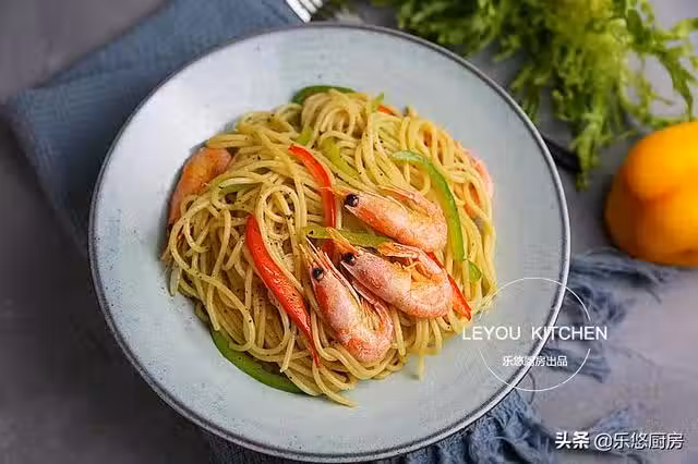 第一步:準備食材。義大利面200克、北極蝦適量、青椒1個、彩椒半個、洋蔥半個。