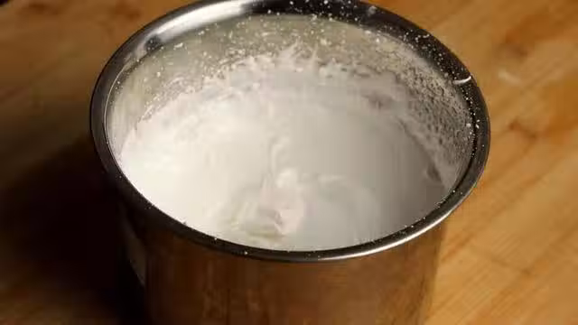 3、下面打發蛋清,放一點檸檬汁,放20g的棉紗糖,然後用打發器攪拌,低轉速打發出白沫,然後再加入白糖,快速打發,將蛋清打發至這種狀態就可以了