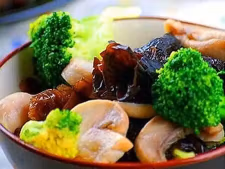 原料:蘑菇2朵,西紅柿1個,西蘭花少量,椰子油、鹽、薑少量。