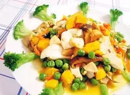 西蘭花芒果豆腐是一道色香味美的素食料理,是將芒果、豆腐、草菇、青豆和紅蘿蔔等多種食材切丁拌炒而成,成菜不僅口感爽脆、果香濃鬱,還對健康有益。秋湄稱,西蘭花芒果豆腐可以開胃增食慾,又不怕吃多發胖,很適合想減肥瘦身的人常食。