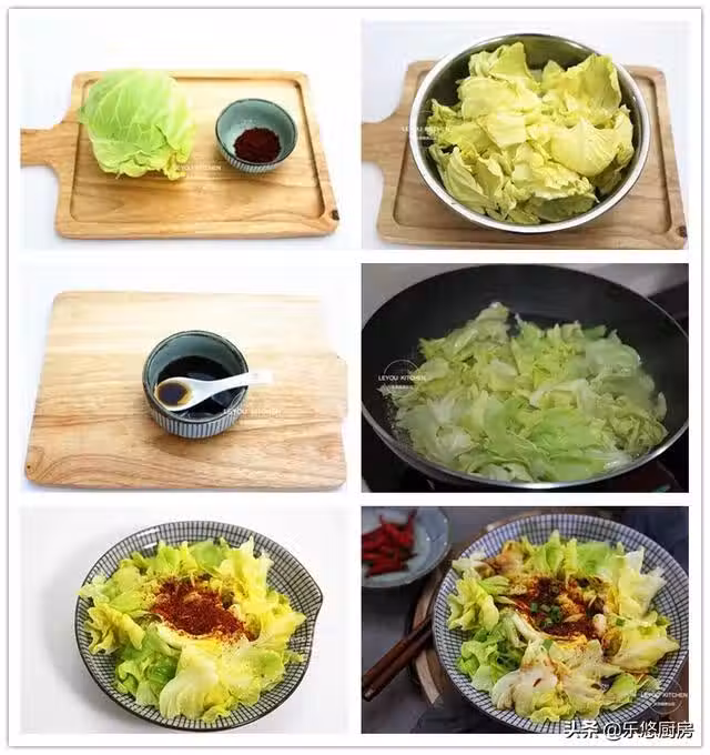 第七步:鍋中倒入適量的油燒至冒燒,然後把油澆在圓白菜的辣椒粉上,再淋上剛調好的料汁拌勻,即可上桌開動。