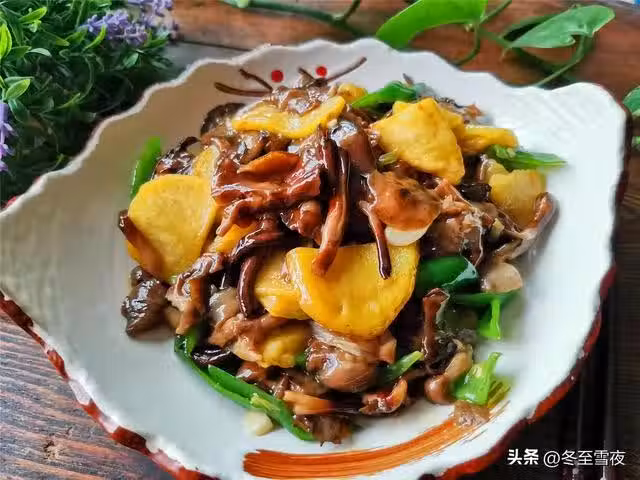 6.再下入炸好的土豆片,尖椒片,一起大火翻炒均勻,淋入生抽,加入白糖,翻炒均勻,淋入適量水澱粉勾芡,加熱至湯汁變得黏稠,關火,盛出裝盤即可。一盤色香味俱全的榛蘑燒土豆片就做好了。