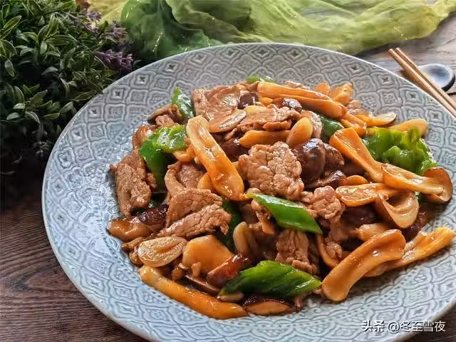 【赤松茸炒肉片】所需材料:赤松茸1斤、小裡脊半斤、尖椒1個、油鹽適量、大蒜3瓣、蚝油1湯匙、生抽1湯匙、老抽半湯匙、料酒半湯匙、胡椒粉1茶匙、澱粉半湯匙、雞精1茶匙、