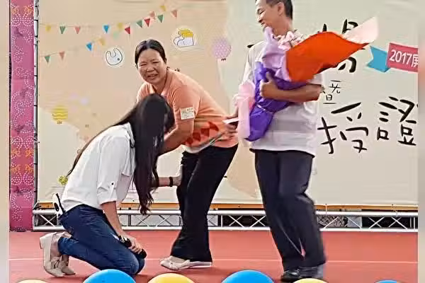 林靜玫跪下來含淚給張鴻祺、郭巾錦夫婦獻花。