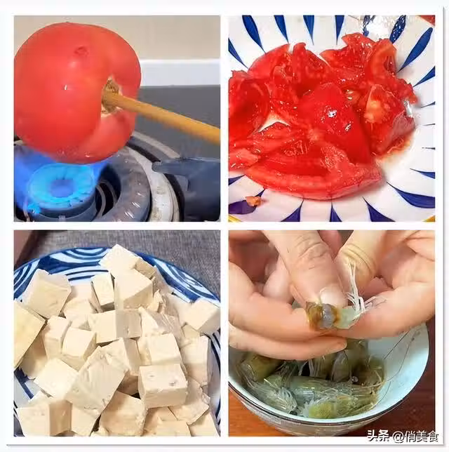 金針菇撕小朵,切兩段;蔥姜熱油下鍋,炒香加蝦頭,蝦頭炒至變色撈出,加西紅柿,翻炒出湯汁。