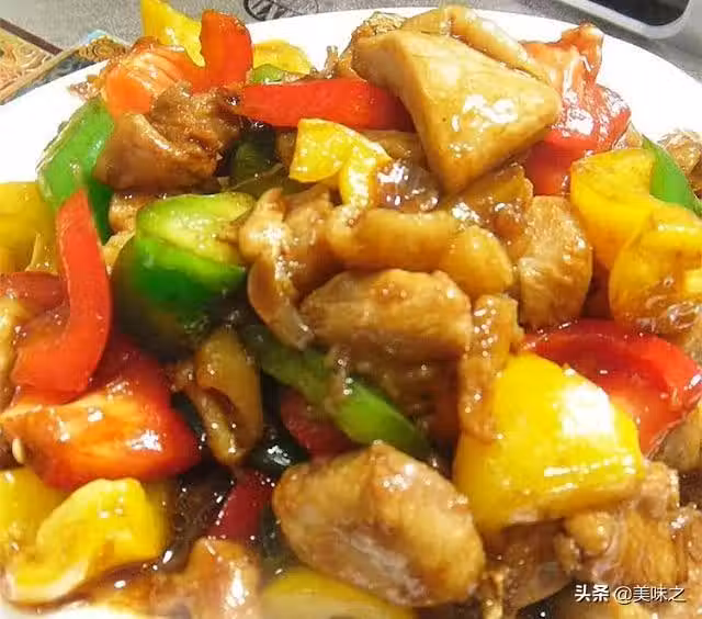 雞腿2個、彩椒100克、油20克、澱粉適量、蔥適量、姜適量、鹽5克、白糖2克、蚝油10克、老抽2克、胡椒粉2克、料酒10克。