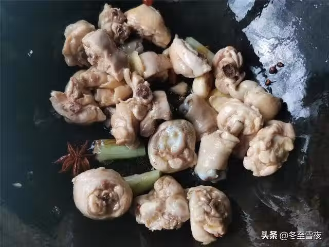 6.鍋內加入油燒熱,下入蔥段,薑片,蒜粒,花椒,大料,干辣椒炒香,再下入雞塊翻炒1-2分鐘。