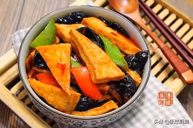 第一步:準備食材。滷水豆腐一塊、紅辣椒一個、綠辣椒一個、干木耳幾個、姜適量、蒜適量。