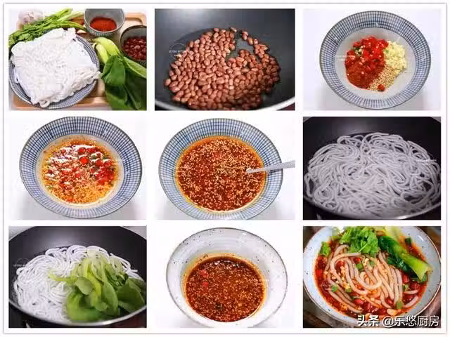 第九步:把粉撈到碗里,再放上一些油菜、熟花生、香菜,然後就可以上桌開動了。