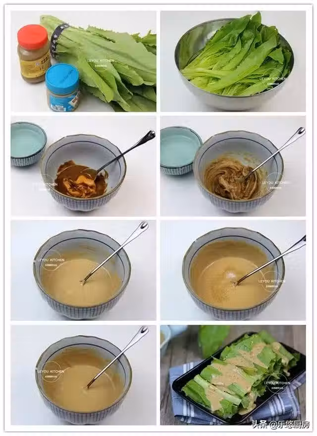 第八步:把油麥菜切成段,然後澆上麻醬就可以上桌了。