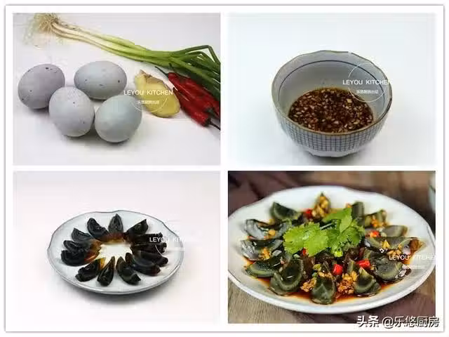第三步:皮蛋去皮,切成幾瓣,然後擺到盤中,如圖。(在切皮蛋的時候,可以往刀上抹一層香油,這樣就可以很好的防粘了。另外,也可以將皮蛋提前蒸或煮一下,這樣吃起來更放心,也更容易切。)