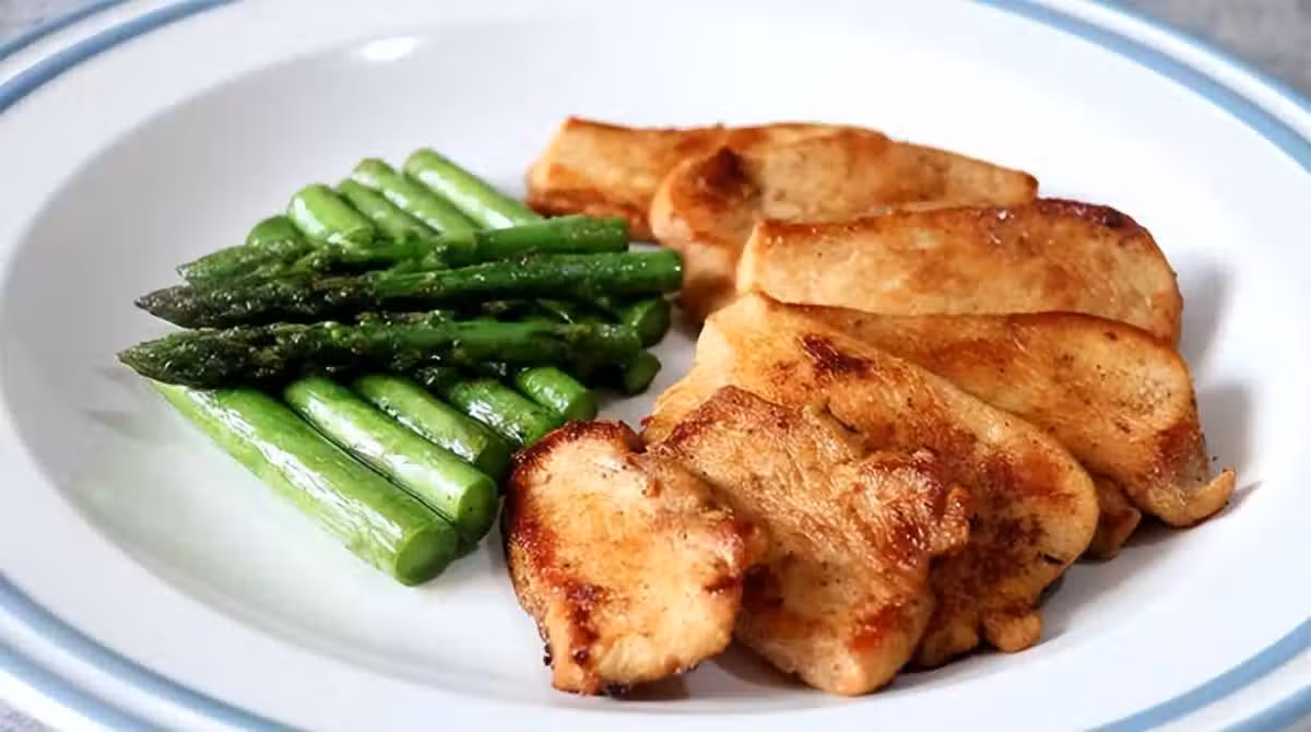 3、不粘鍋內少放油,或者不放油,小火慢煎雞胸肉,煎好以後就可以出鍋啦!吃的時候可以配上蘆筍、胡蘿蔔之類的素菜,營養又美味。