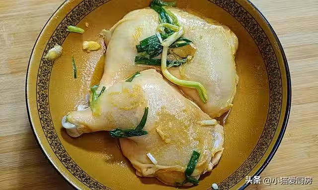 【步驟三】: 雞腿腌制好後,另外取一個盤子,把切好的薑片和小蔥段鋪在盤子底部,同時把腌制好的雞腿擺放在盤子中的薑片和小蔥上。