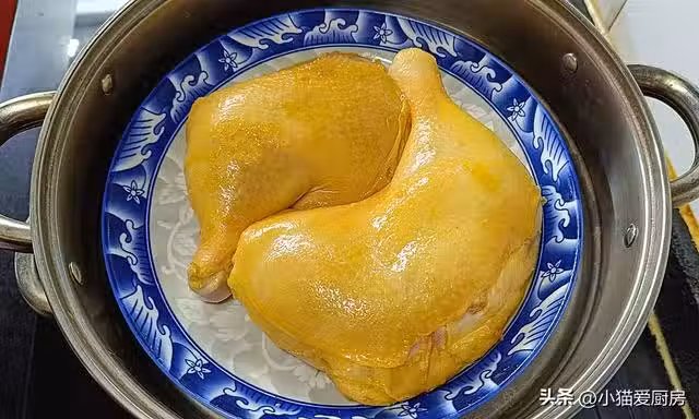 【步驟六】:把蒸熟的雞腿取出來放入大碗中放涼,然後用手把雞腿,撕成小塊備用。