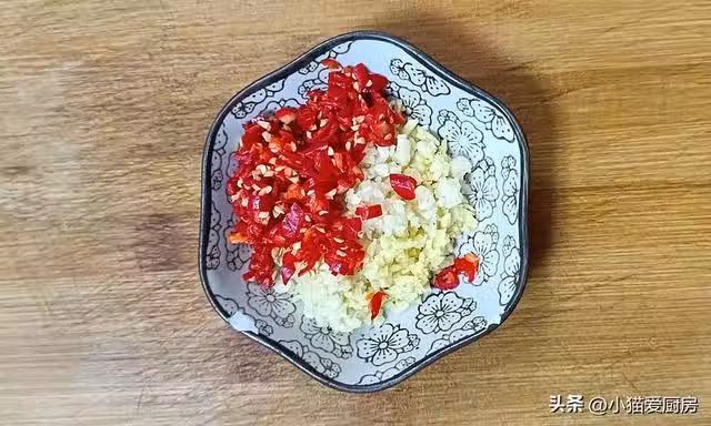 【步驟五】: 黃瓜水分晾乾後放入盆中,再依次放入生薑和大蒜切成末、小米辣、白糖2勺、鹽少許、白酒2-3勺、辣椒麵3-4勺、雞精2勺,抓拌均勻。