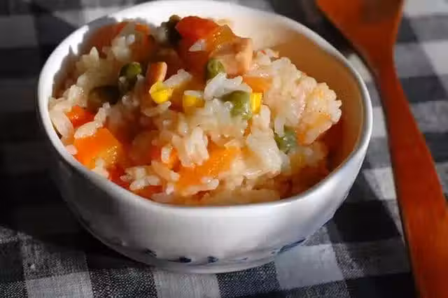 大米200g、番茄一個、胡蘿蔔一根、玉米半根、豌豆半碗、火腿腸一根、鹽一勺、橄欖油適量、黑胡椒粉適量、水適量