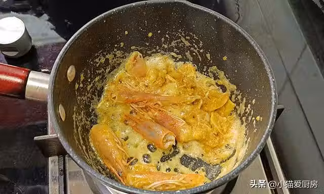 【步驟八】:蝦頭炒出蝦油,放入開水煮2分鐘,把蝦頭撿出來,放入豆腐繼續燉煮2分鐘。