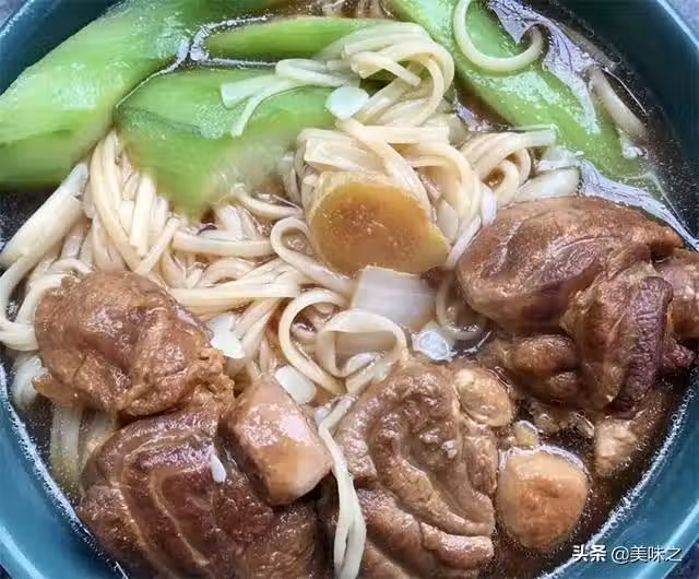 絲瓜1根、燒肉幾塊、空心面80克、清水300克、燒肉湯汁3勺。