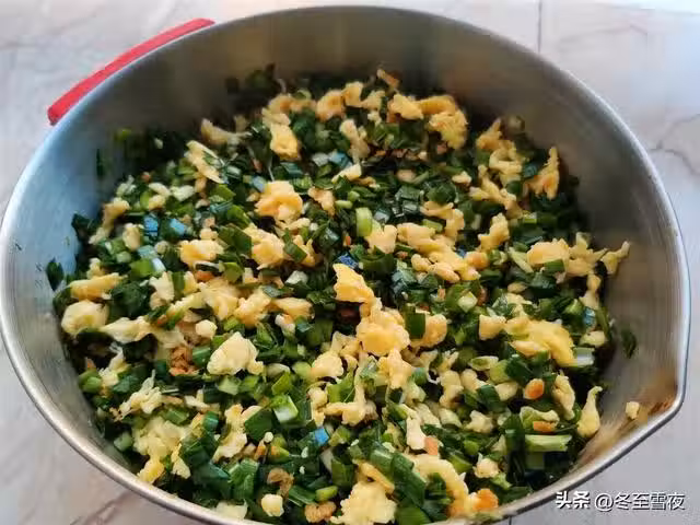 【韭菜雞蛋餡包子】所需材料:韭菜1.5斤、雞蛋5個、蝦皮適量、豆油、鹽適量、