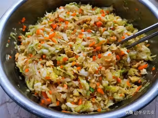 5.把包菜放在盆內,加入粉條碎,雞蛋塊,胡蘿蔔末,蔥末,再加入熟油,或者色拉油也可以,蚝油,生抽,花椒粉,十三香,用筷子朝一個方向攪拌均勻,包子餡就調好了。