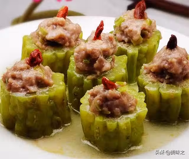 豬肉餡100克、苦瓜1根、蔥適量、姜適量、鹽2克、雞精2克、香油適量、料酒適量、澱粉適量、枸杞適量。
