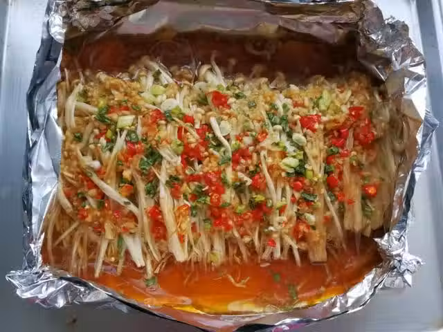 準備食材:蒜剁成蒜蓉,小米辣切碎。一起裝入碗內,加入生抽、雞精、鹽、油攪拌均勻待用。金針菇洗凈控干後擺放在錫紙上。我把錫紙放在烤盤上,用了兩層的錫紙,預防爛掉。金針菇擺放好後,把四邊的錫紙捏成一個盒子的形狀,預防烤了後金針菇出水流得到處都是。