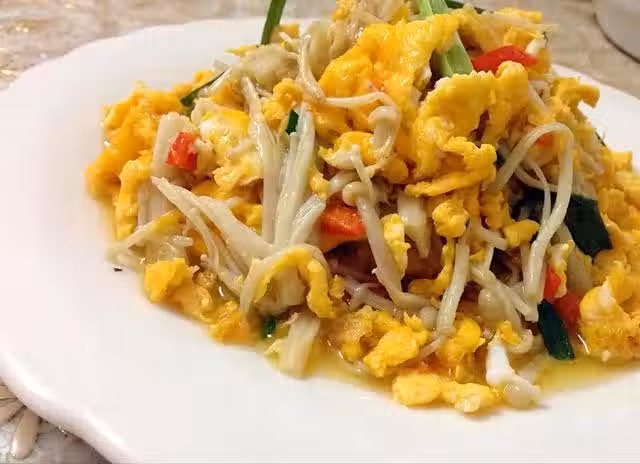 金針菇250G;雞蛋3隻;小蔥;紅辣椒;食用油;料酒;鹽;雞精