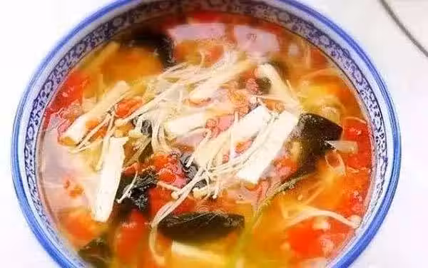 3、砂鍋坐水,水開後放入西紅柿丁和豆腐條同煮十分鐘,加入金針菇煮軟後放入小油菜稍煮片刻,調入少許鹽,加入香油即可。