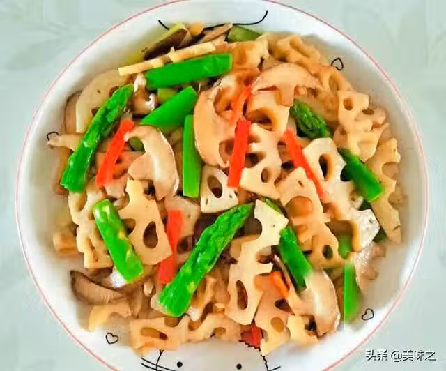 2、蓮藕切片,蘆筍切條,蓮藕焯水2分鐘加入蘆筍半分多鐘,撈出過涼。