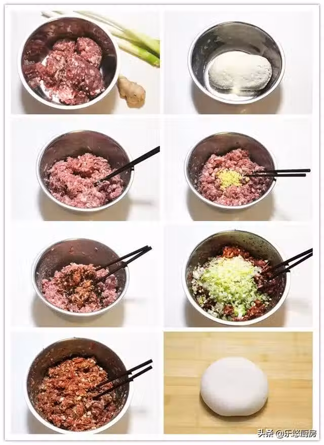 第七步:朝著一個方向用力攪拌肉餡,直至肉餡起勁,感覺攪不動為止。圖為攪拌好的樣子。因為我用的是現成的豬肉餡,所以大蔥分開放。如果你用的是豬肉,可以直接大蔥剁到肉中,那樣味道更好。