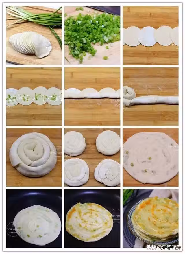 第八步:全部卷好後稍稍壓平,放到案板上松馳5-10分鐘。鬆弛一會兒,烙好的餅口感更好。
