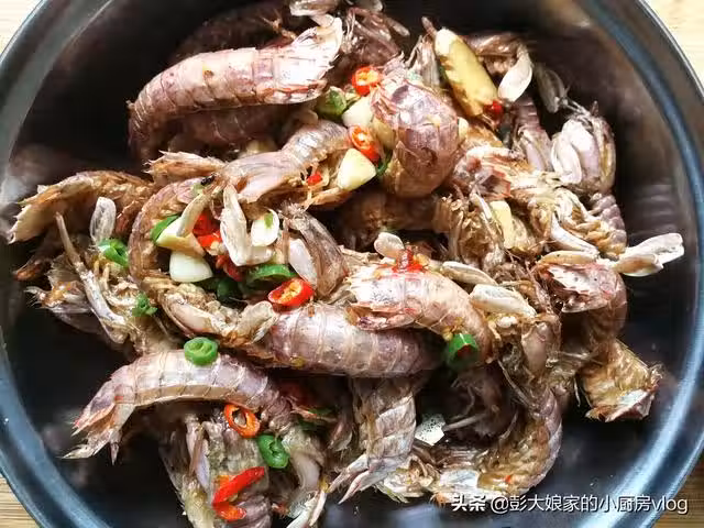 4,鍋內留底油,炒香姜蒜,下皮皮蝦,辣椒圈,椒鹽,翻炒片刻即可。