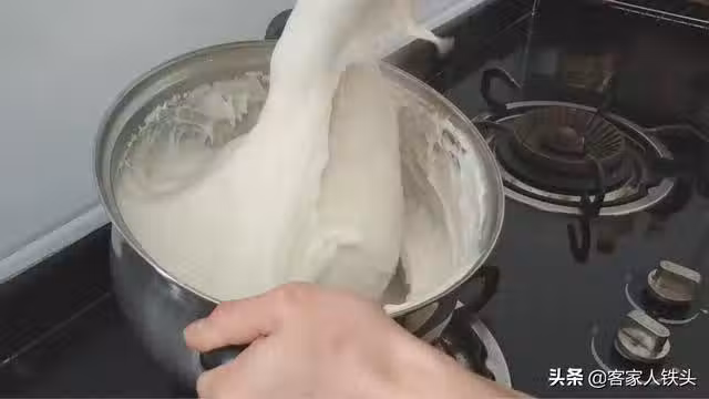 第八步:大概鼓搗有20分鐘左右,把它提起來粉糊面光滑就可以了,出鍋撒點熟糯米粉防粘