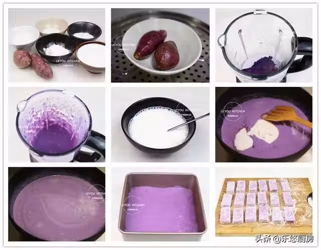 第九步:把做好的紫薯糕脫模,然後切成塊,在表面粘一層椰蓉即可。(放到冰箱冷藏後食用,味道更好哦。)
