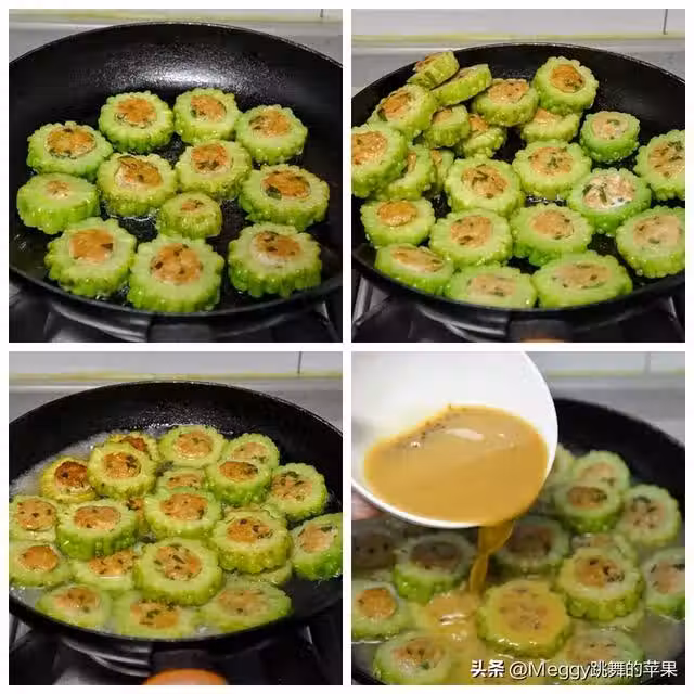 1. 這道菜也可以用蒸的方法,口感更清爽:入開水蒸鍋,蒸5分鐘,瀝出的汁水勾薄芡,煮到黏稠透明後淋在苦瓜圈上;