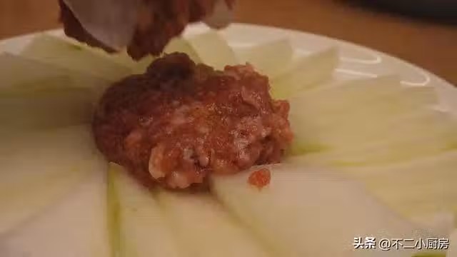 4、接著把處理好的肉餡放入到冬瓜中,給它鋪好,再次放上一塊肉餡,用手給它按壓一下,按壓成一個小餅的狀態,最後在中間掏上一個洞,方便放蔥花。