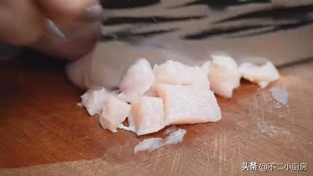 1、首先準備一塊雞胸肉從中間片開,然後把雞胸肉切成厚厚的條,寬度大約在一公分左右,接著再把雞胸肉切成小丁,寬度同樣掌握在一厘米,切好之後放入到碗中。