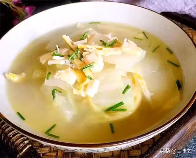冬瓜700g、乾貝50g、扁尖筍2根、色拉油少許、料酒2勺、鹽少許、雞粉少許、薑片3片、蔥花少許。