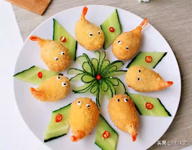 7、用沙拉醬點綴成魚的眼白,放兩顆黑芝麻,弄成眼睛,這道可愛的芝士蝦球就做好了。