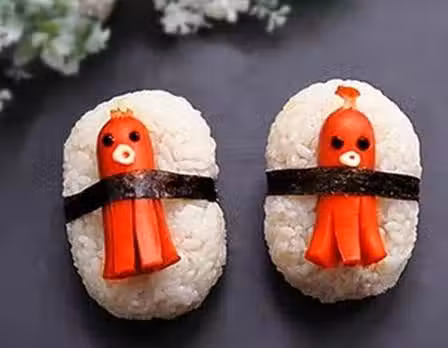 海苔剪兩根長條,把做好的火腿腸小章魚和飯糰包起來