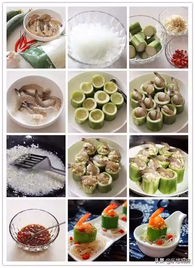 第十一步:絲瓜蝦仁蒸好後開始擺盤。先在盤子底部鋪一層粉絲,然後放一個絲瓜蝦仁盅。最後淋上碗汁、澆少許熱油即可。