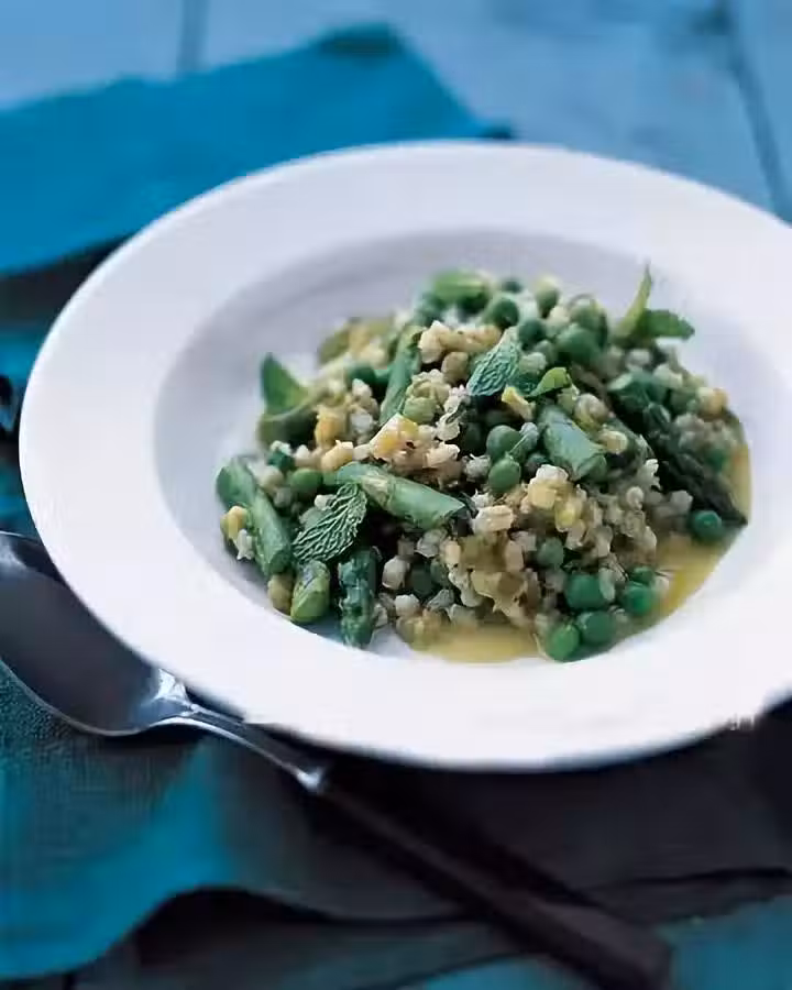 2匙橄欖油,1杯珍珠大麥,鹽,胡椒粉,400毫升素高湯,1束蘆筍,1盒冷凍豌豆,1/4杯薄荷葉。